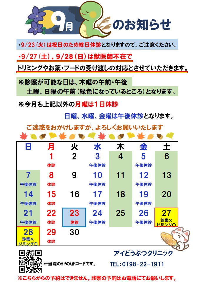・9/27(土)、9/28(日)は獣医師不在でトリミングやお薬・フードの受け取りの対応とさせていただきます。