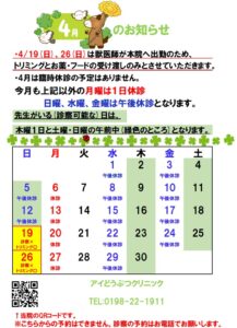 ・4/19(日)、4/26(日)は獣医師が北上の本院へ出勤のため、